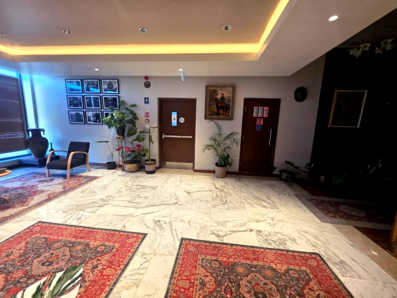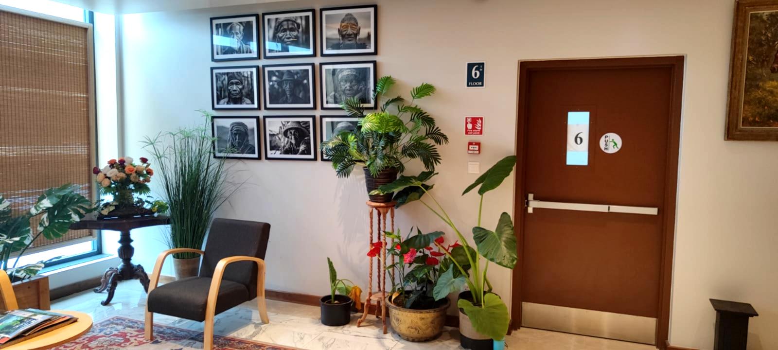 Wide corridors, art, plants, vintage pieces and space to reset between meetings.